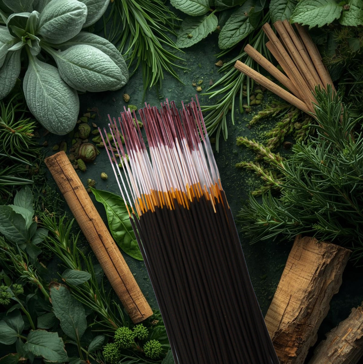 Sage & Santo™ incense sticks. A green woody fragrance with spicy notes of sage, rosemary, cedarwood, pine needle, frankincense and palo santo wood.