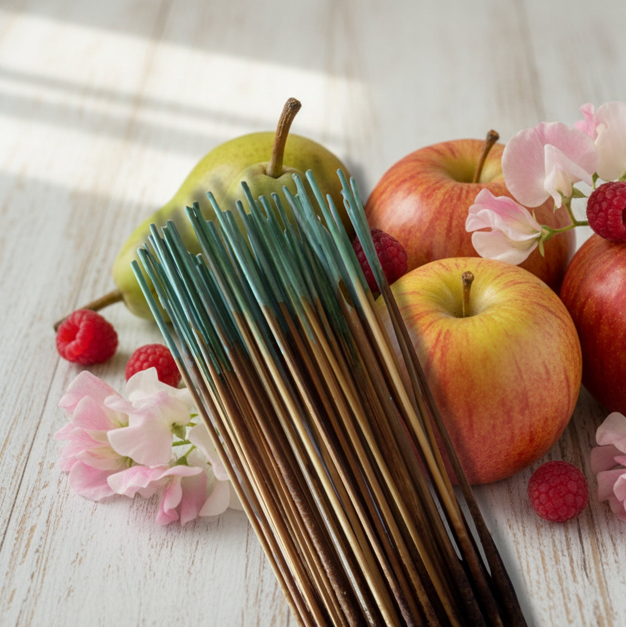 Sweet Pea (type) incense sticks. A bright fruity floral fragrance with notes of Anjou pear, gala apple, pink sweet pea, Mediterranean cyclamen and summer raspberry. Our version of the popular scent by Bath & Body Works.